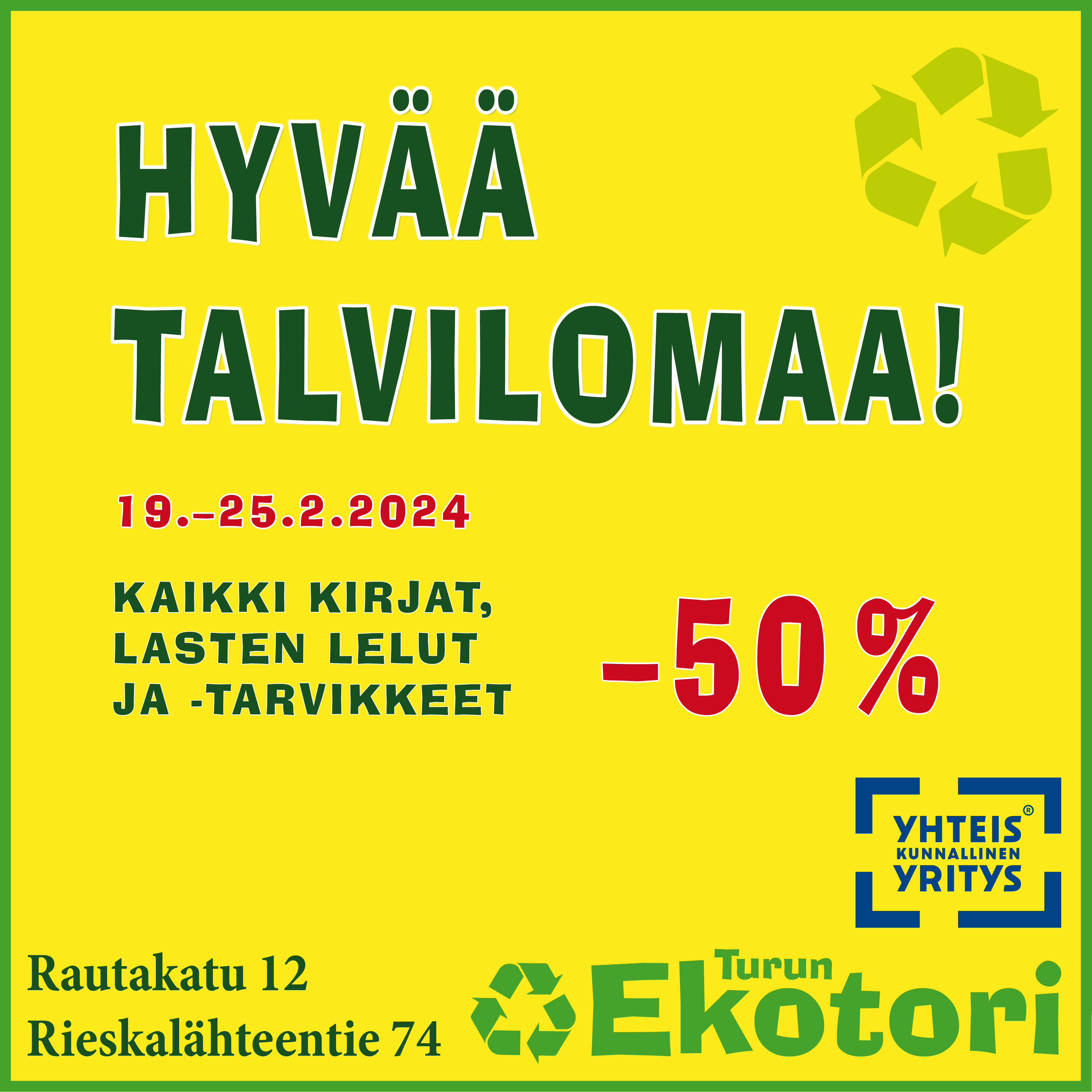 Myymälöissämme kaikki kirjat, lasten lelut, ja -tarvikkeet –50 % 19.–25.2.2024 talviloman kunniaksi. Myös verkkokaupassamme kaikki kirjat –50 % 19.–25.2.2024.