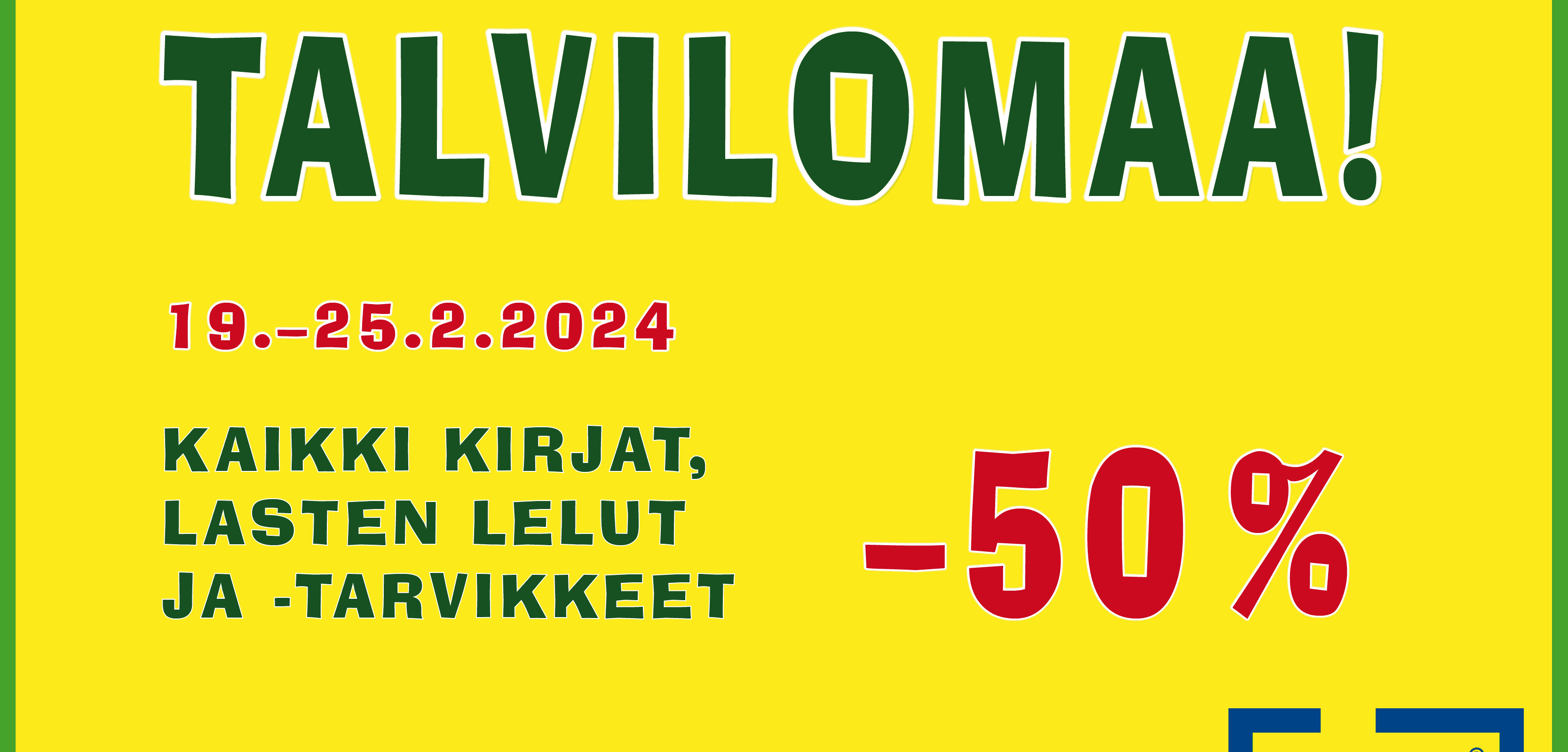 Myymälöissämme kaikki kirjat, lasten lelut, ja -tarvikkeet –50 % 19.–25.2.2024 talviloman kunniaksi. Myös verkkokaupassamme kaikki kirjat –50 % 19.–25.2.2024.