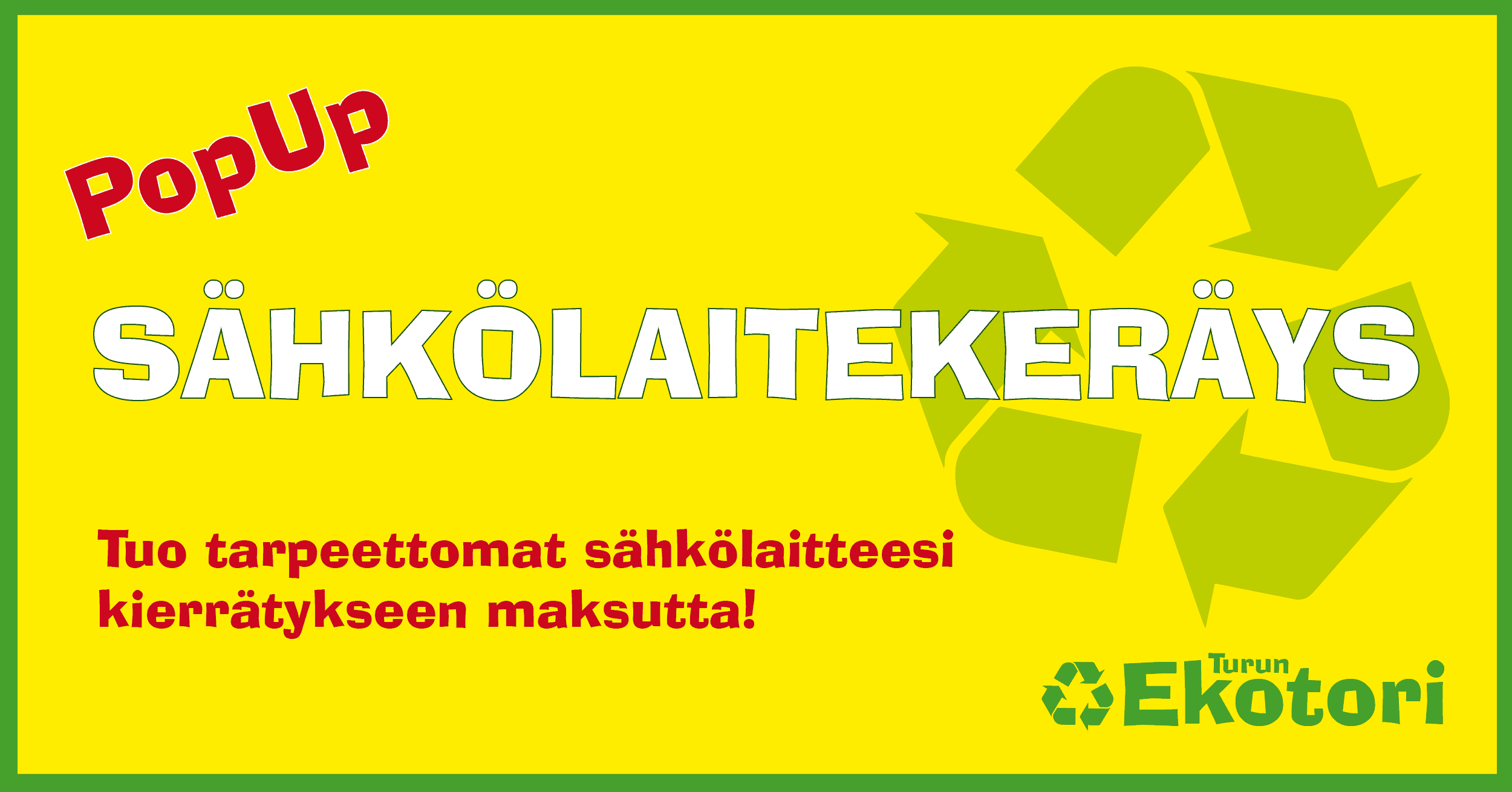 Voit tuoda PopUp-keräykseen ehjiä sekä rikkinäisiä tarpeettomaksi jääneitä kodin sähkölaitteita. Otamme keräyksessä vastaan myös käytettyjä tietokoneita ja kännyköitä. Tuothan PopUp-keräykseen vain tavaroita, jotka jaksat itse kantaa paikalle.