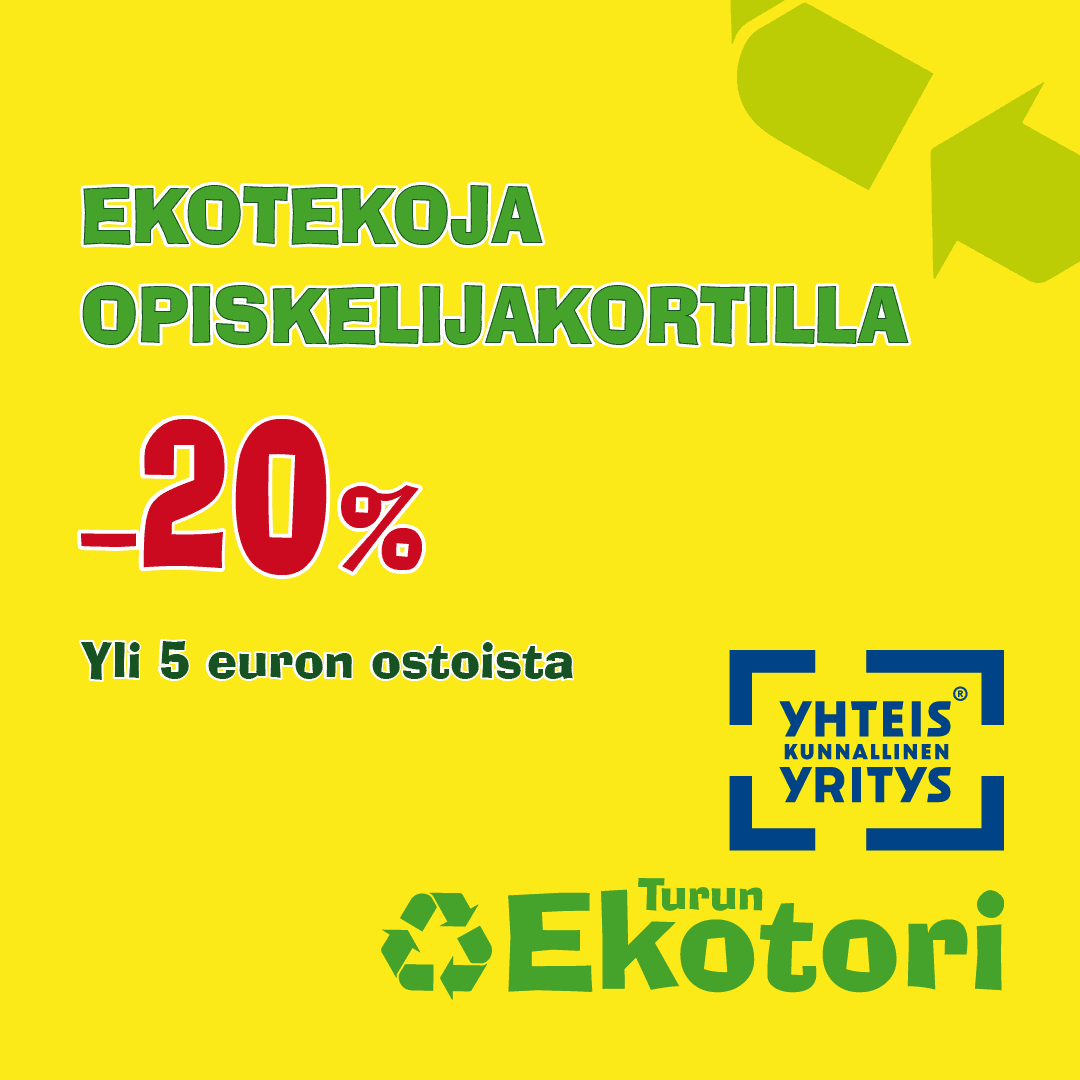 Turun Ekotori toivottaa uudet opiskelijat tervetulleiksi, ja haluamme muistuttaa, että tarjoamme 20 %:n opiskelija-alennuksen voimassa olevalla opiskelijakortilla, vähintään 5 euron kertaostosta. Tarjoamme opiskelija-alennuksen myös kuljetuksista. Opiskelijakortti tulee mainita tilausta tehdessä ja kortti tulee näyttää maksettaessa.