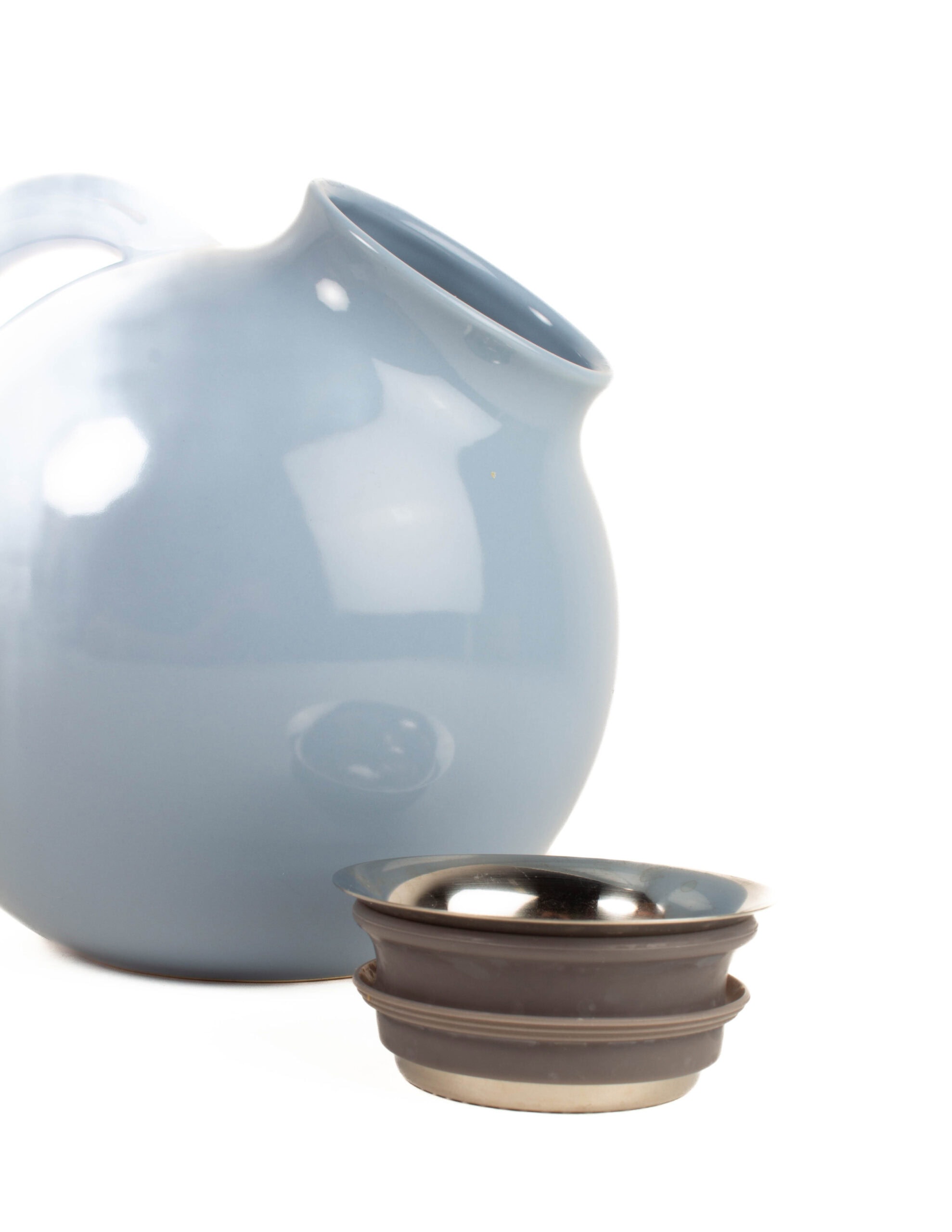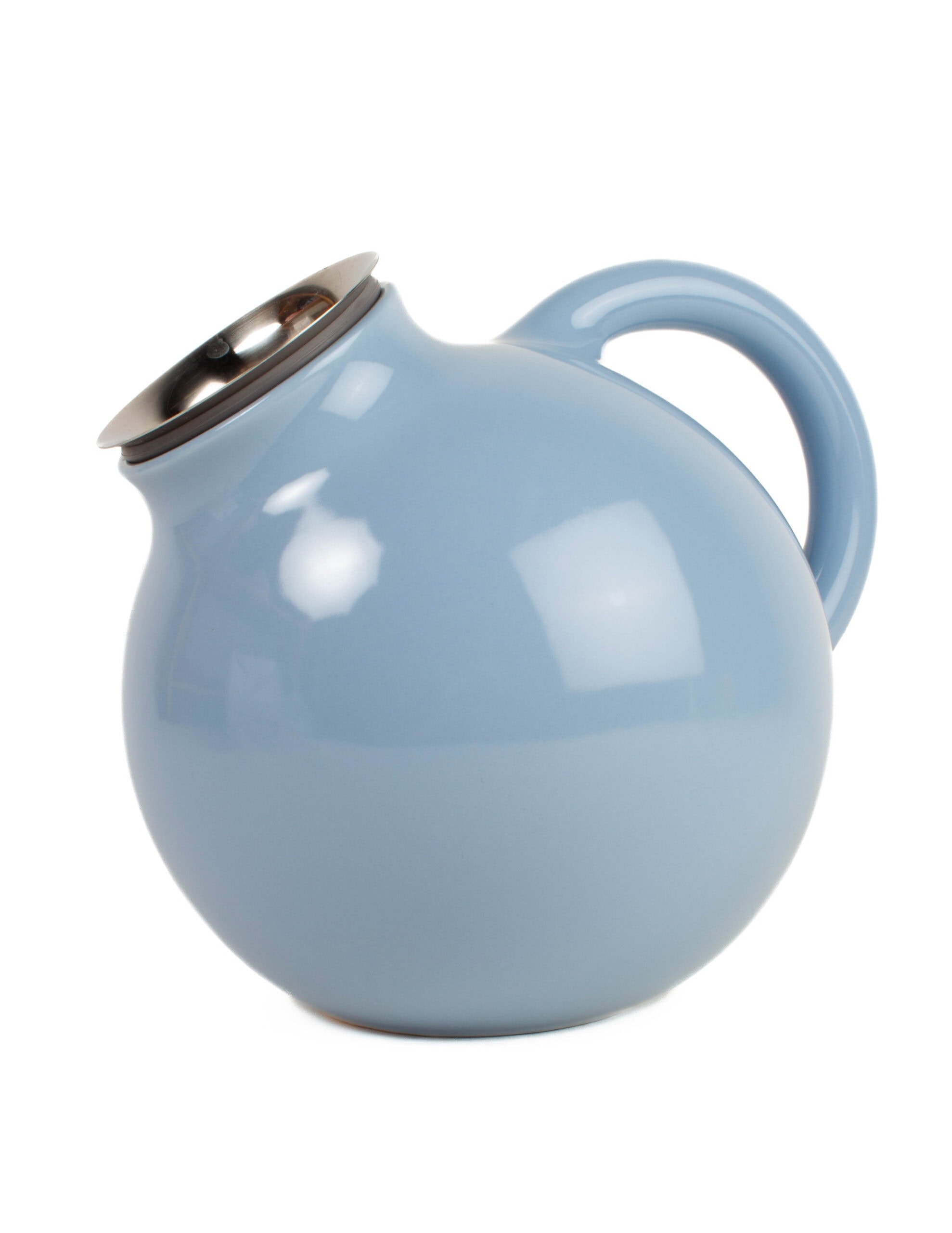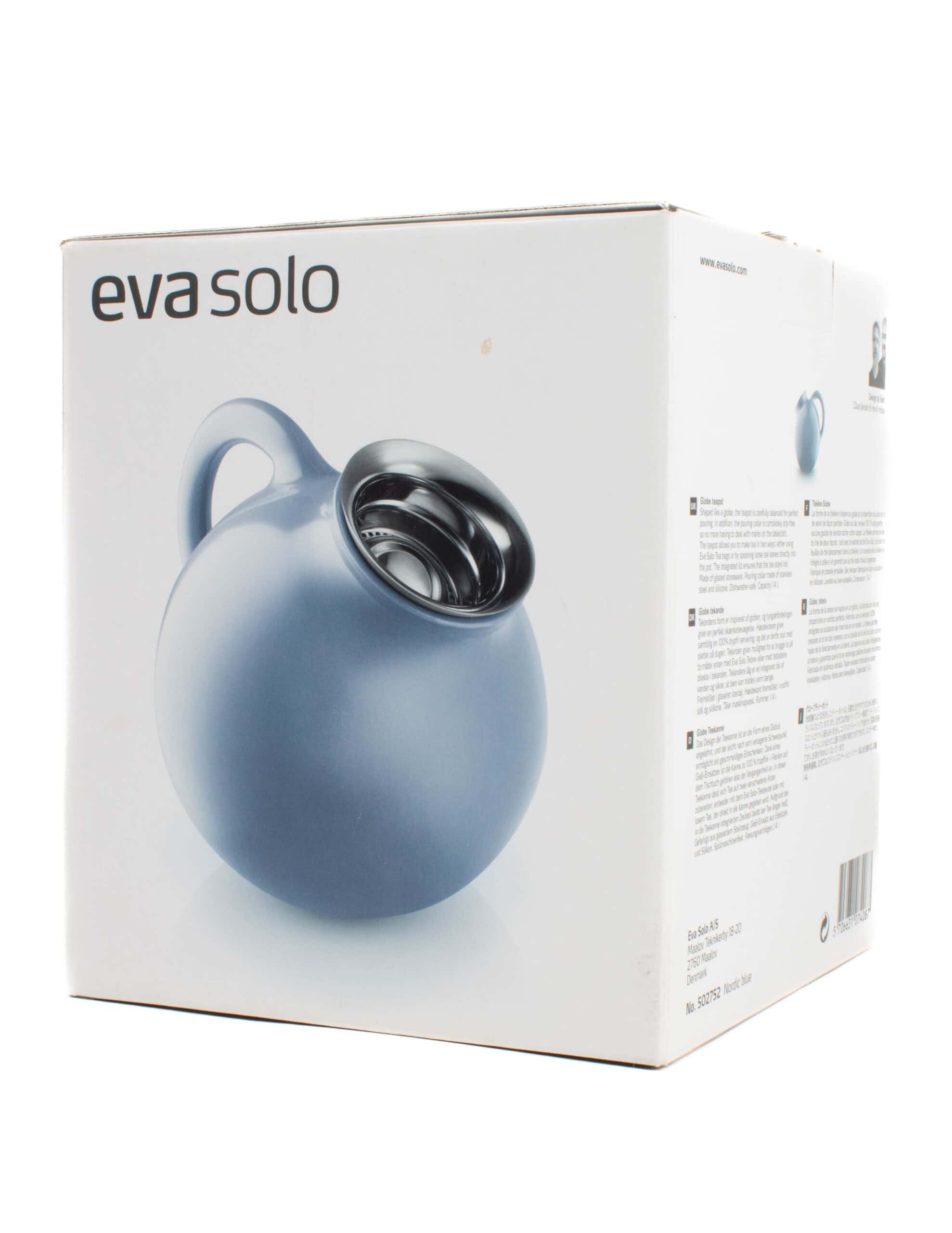 Vaaleansininen pyöreä teekannu, alkuperäisessä pakkauksessaan.