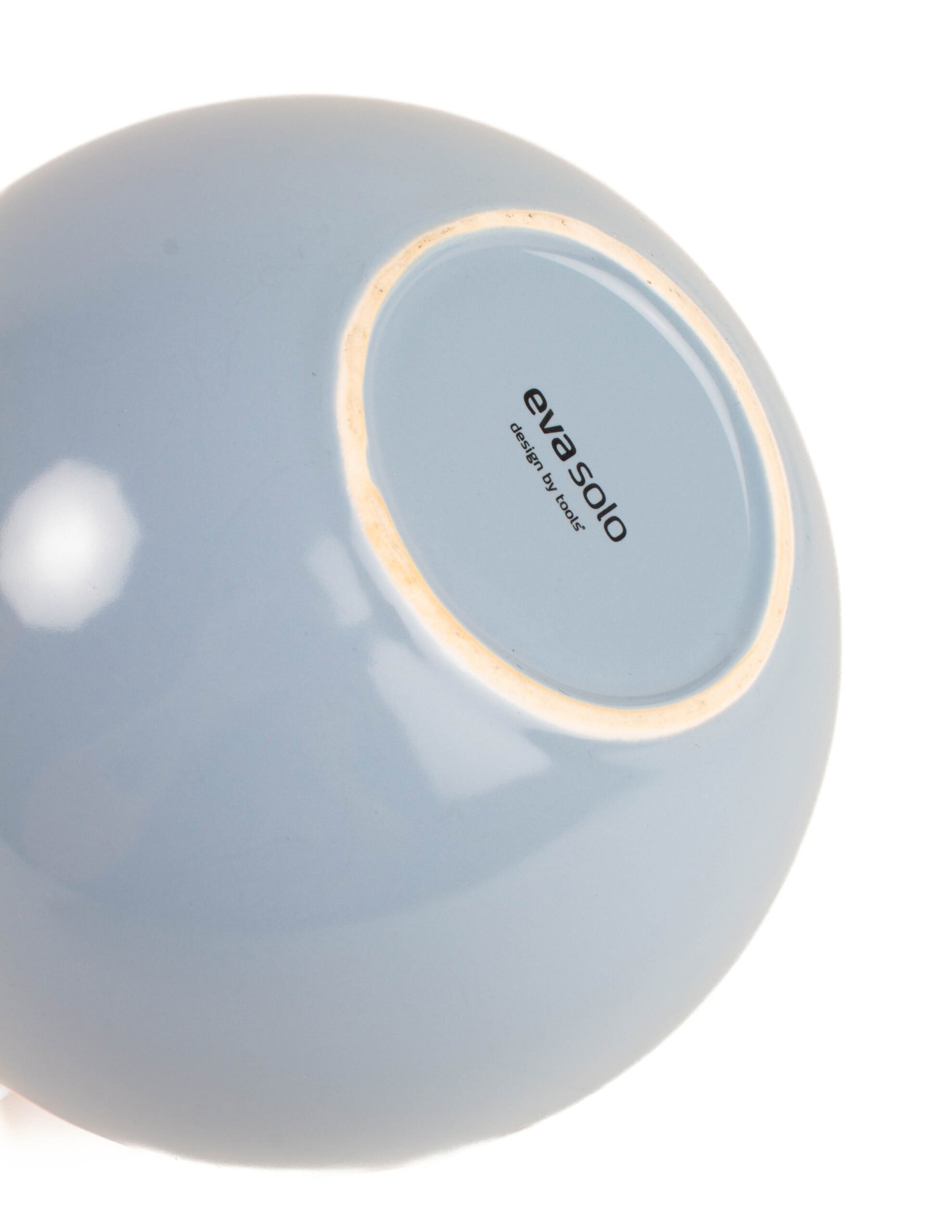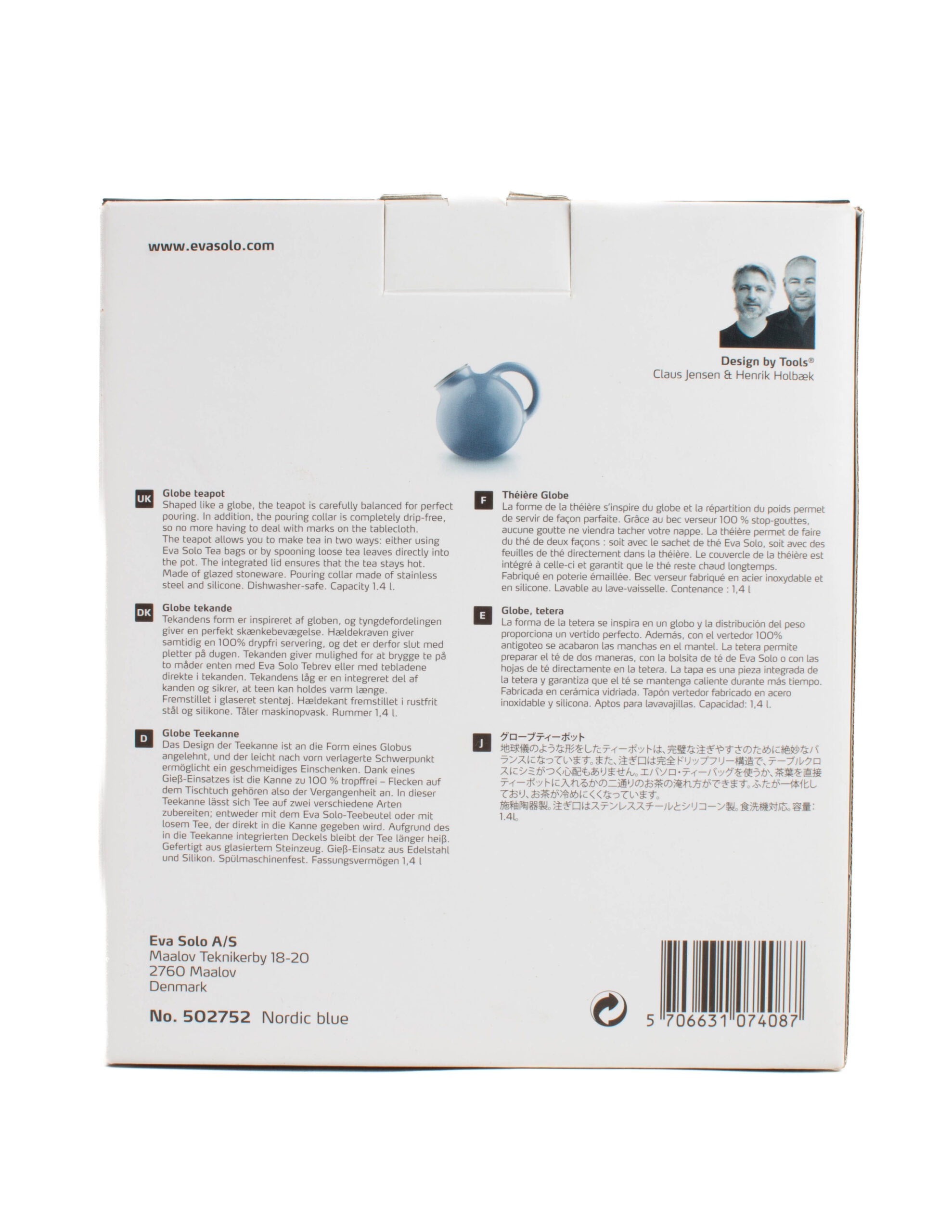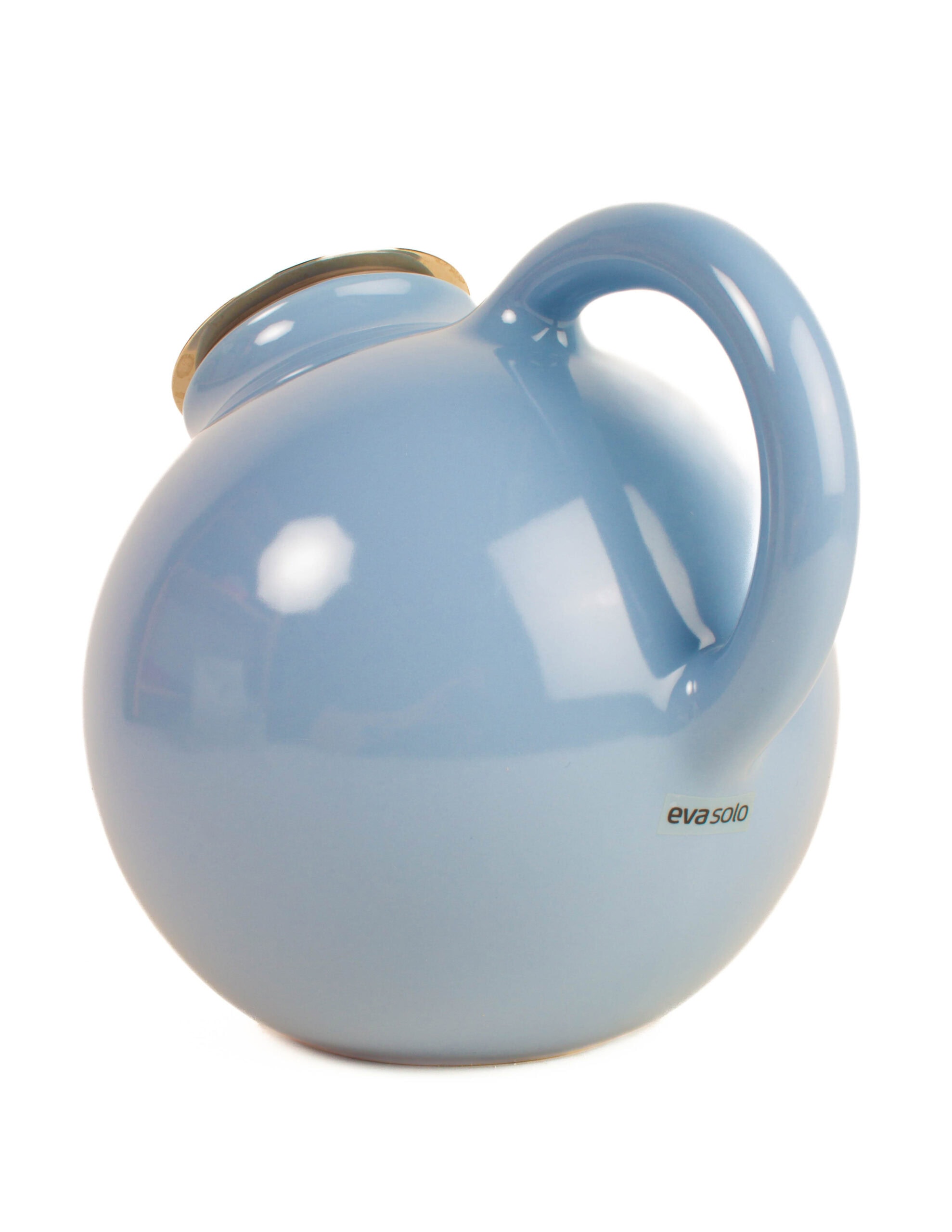 Vaaleansininen pyöreä teekannu, alkuperäisessä pakkauksessaan.