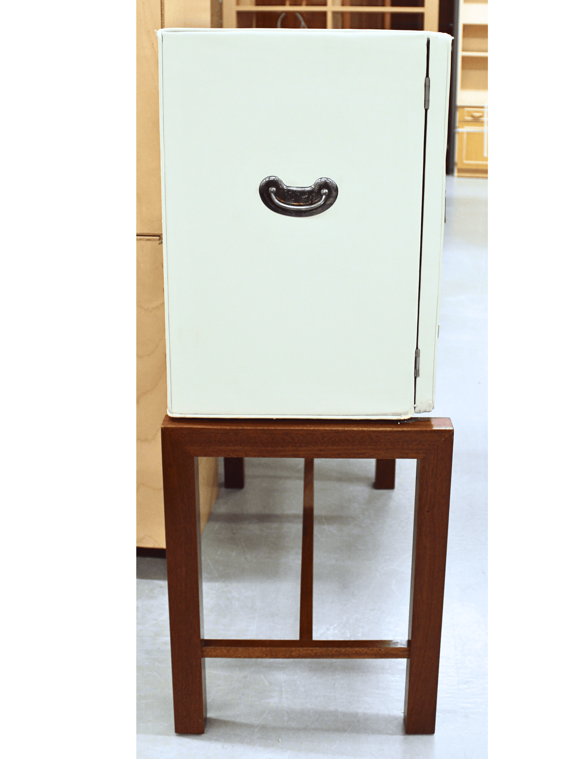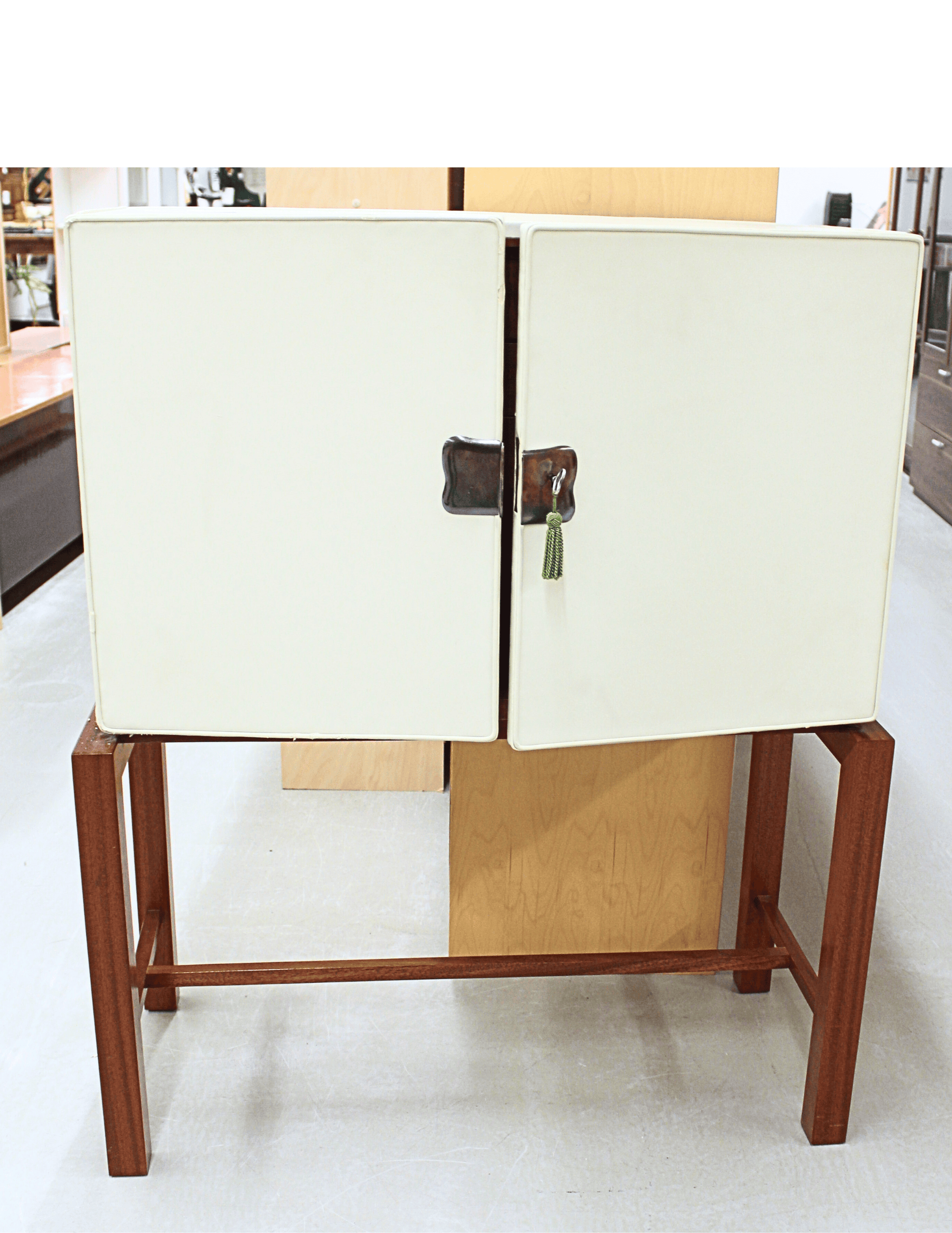 Vaalealla nahalla päällystetty kaksiovinen kaappi.