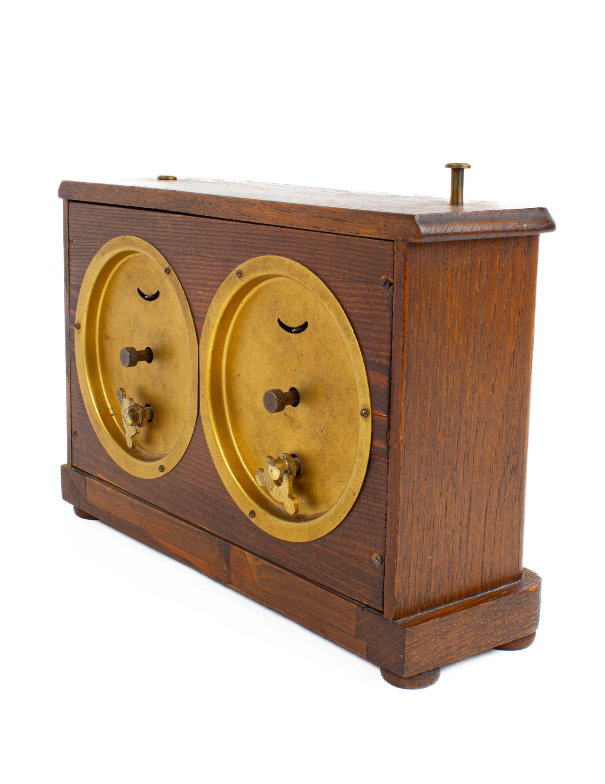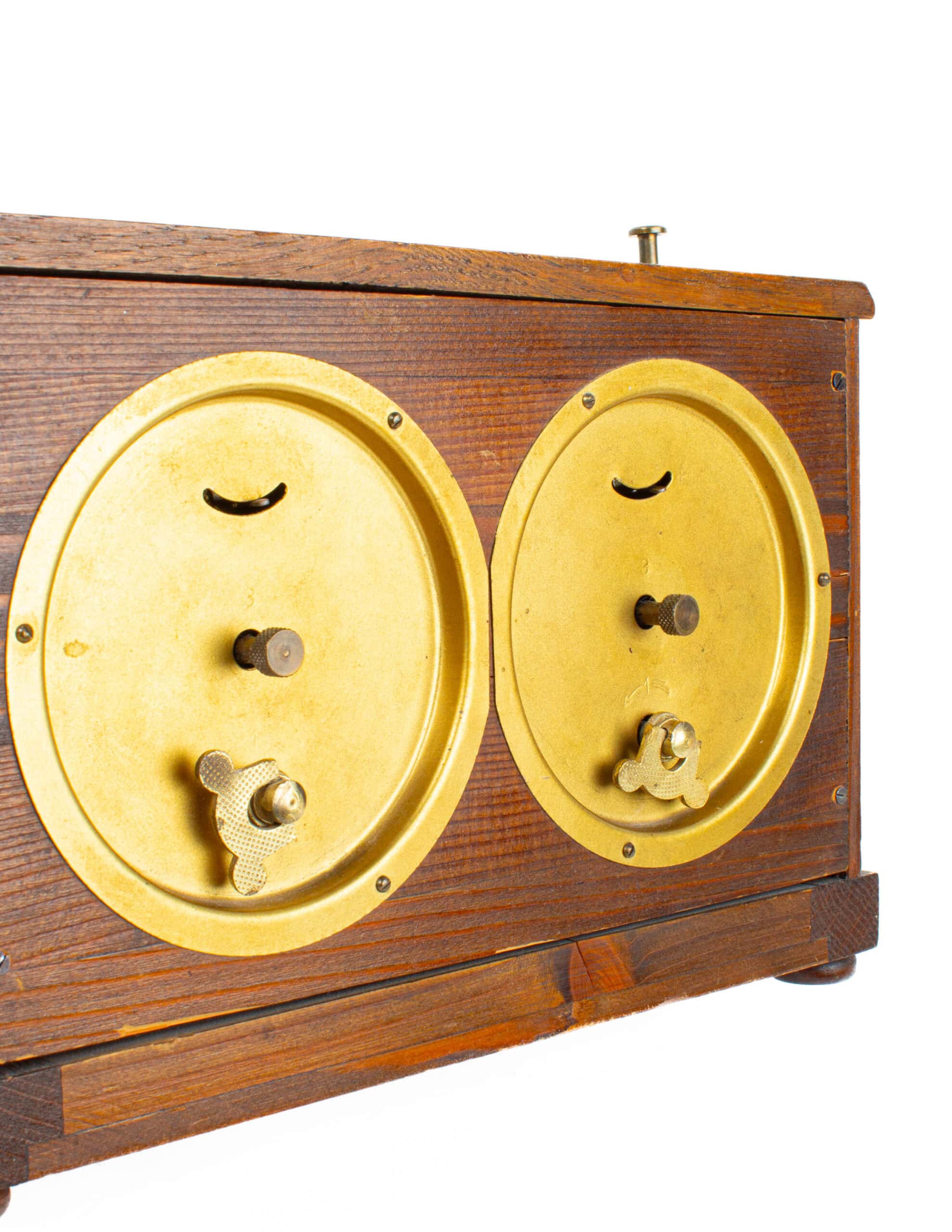 Valmistettu 1900-luvun alkupuolella. Tehty messinkistä ja puusta.
